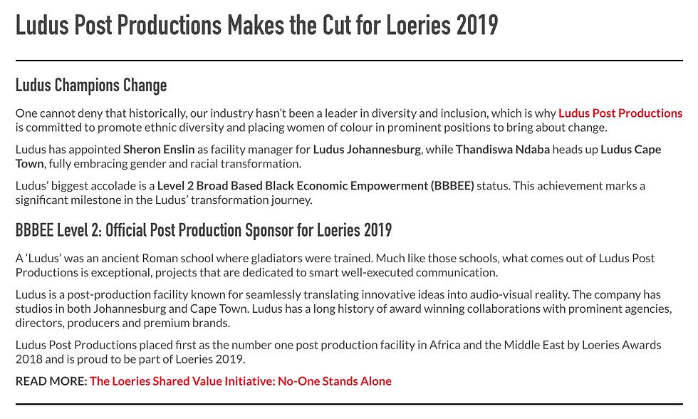 The Call Sheet profiles The LudustheludusJun 14, 20191 min readThe Call Sheet has also announced that The Ludus is the official partner of The Loerie Awards 2019. Read more about our partnership and our commitment to transformation HERE.